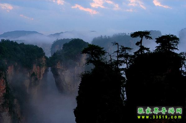 在“后花園”的對面,是一座巍峨的山巒,山上古木參天,遮天蔽日。森林中常有野山羊出沒,夜深人靜之際,常能聽到野羊羔“咩洋”地叫聲,因此被稱作“羊寨”。民國時期,此地曾為土匪占領(lǐng),直到現(xiàn)地,山上還殘留有卡門、暗堡、斷壕、屋場、水井、碓臼、磨坊等殘跡。粗大的松樹上還留有土匪當(dāng)年留下的“V”字型標(biāo)志。站在“山寨”上,舉目眺望,可看見金鞭溪全景,只見一條美麗的溪水從數(shù)百座石林中緩緩穿過,顯得是那樣的幽靜、和諧。從“后花園”向前步行約100米,便是袁家界又一處絕世奇觀——迷魂臺,走上迷魂臺,只見上百座山巒拔地而起,峰涌而至,它們姿態(tài)萬千、氣勢非凡;有的似“天狗望月”,有的像“海螺出水”;有的像“將軍列隊”,有的如“一柱擎天”。幾道山坳和屏障將這些山巒有序的分開,使這些石峰更顯得層次分明,井然有序,在萬道霞光的點(diǎn)綴下,顯得蔚為壯觀,不同凡響。這更像是一幅畫家筆下的水墨丹青,“迷魂臺”攬勝,真宛如仙境神游啊。
