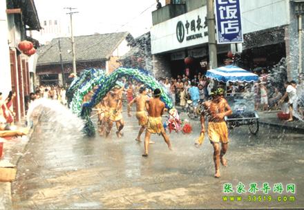 張家界潑水龍又叫“澆水龍”,于唐朝時(shí)期由移居本地的白族興起演變而成,在永定區(qū)的尹家溪鎮(zhèn)西尹村、莫家崗村十分盛行,是當(dāng)?shù)?a class="insidelink" href="http://m.xmuisedu.com/fengqing/1130174734.html" target="_blank" title="土家族">土家族,白族、苗族在天熱干旱時(shí)節(jié)求雨祈福的一種形式。一旦出現(xiàn)旱災(zāi),當(dāng)?shù)仡^面人物就會(huì)出來組織潑水龍,演出極其隆重。