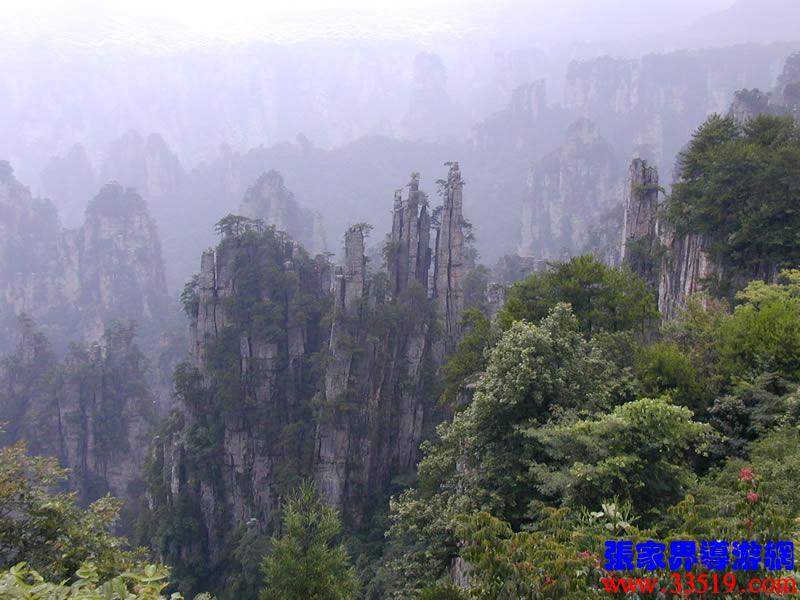 (大觀臺)這就是大觀臺。極目遠眺,千百座奇峰盡收眼底。一位詩人說,武陵源的砂巖峰林是一步一觀景,千步千造型,一山有四季,十步不同天。專家測算出武陵源石峰有3103座。一如一位高超的雕塑大師,模擬宇宙萬物,無不形狀逼真,維妙維肖,栩栩如生,呼之欲動。有的如海螺出水,有的如金龜銜日,有的如蓮花盛開,有的如天橋橫空,有的如長槍刺天,有的如寶塔聳立,有的如老人采藥,有的如玉女梳妝,有的如將軍出征,有的如戰(zhàn)馬長嘯,有的如情人幽會,有的如夫妻相擁,有的如仙女散花,有的如村姑守望.....有的孤峰獨秀,有的直插云霄,有的婷婷玉立,有的威武勇猛,有的小巧玲瓏,有的大氣磅礴。進入武陵源,但見一片峰的森林,峰的世界,峰的海洋。挺拔、奇秀、集中、原始、粗獷、古野。這就是武陵源。一位藝術(shù)大師說:武陵源的山峰,改寫了山的概念。大攝影家陳勃說:“三山五岳堪比美,華夏風光每一流。”王繼杰先生說:“武陵源上三日游,勝讀千篇李杜詩。”許世杰先生說:“秀幽險峻稱奇絕,五岳黃山拜下風。”李成瑞先生為此大抱不平:“神州勝景誰為最?須請霞公重評勘。”可惜徐霞客無緣到大觀臺來,也不可能為武陵源作甚評價了。