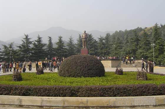 毛澤東銅像位于韶山沖的中心,紀念館、毛氏宗祠與韶山賓館之間。銅像區(qū)占地5200平方米,是經(jīng)中共中央批準興建紀念毛澤東同志誕辰100周年的重點獻禮工程。這里原是一片沃野,地勢平坦開闊,周圍群山拱護。韶蜂在遠處,高峻挺拔,云富坨大山巍峨雄壯,十八羅漢山逶迤綿長,黑石寨鐵骨錚錚。在山的襯托下,銅像更顯得氣勢磅礴。