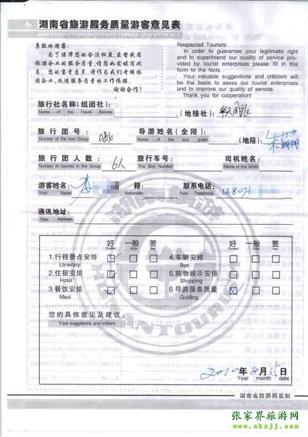 2010年8月15日岳陽李先生一行六位旅游質(zhì)量反饋