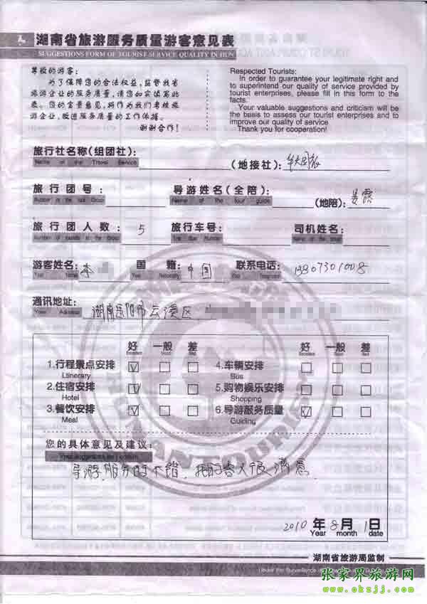 2010年8月1日岳陽(yáng)李小姐一行5位旅游質(zhì)量反饋