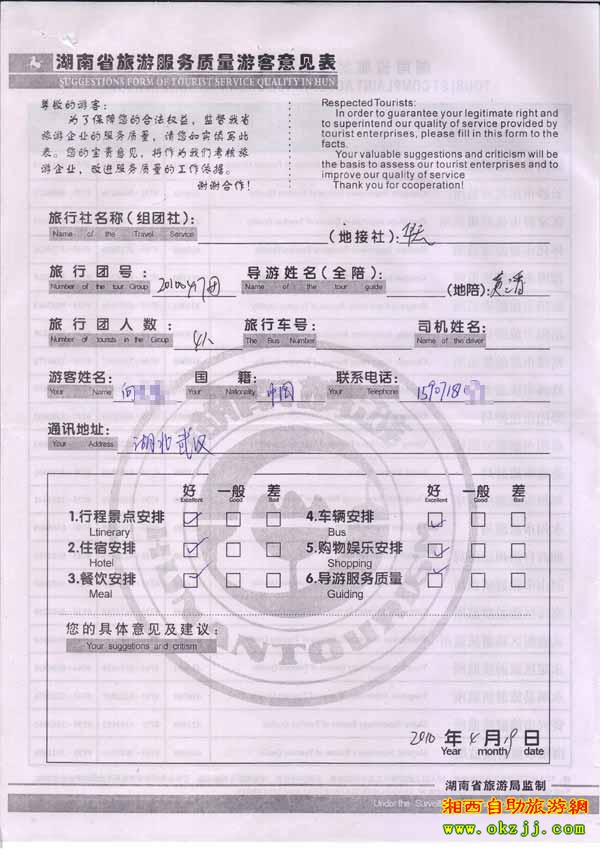 2010年4月19日湖北武漢向先生旅游質量反饋