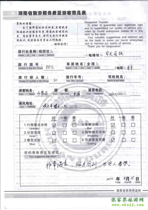 2010年8月15日清遠(yuǎn)馮先生一行20位旅游質(zhì)量反饋:非常滿意,服務(wù)周到,為人著想