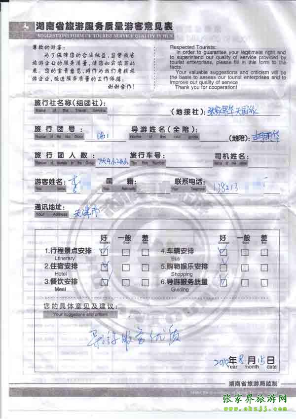 2010年8月15日天津李胡先生一行13位旅游質量反饋:導游服務優(yōu)質
