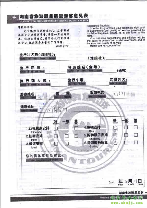 2010年10月16日江先生旅游質(zhì)量反饋