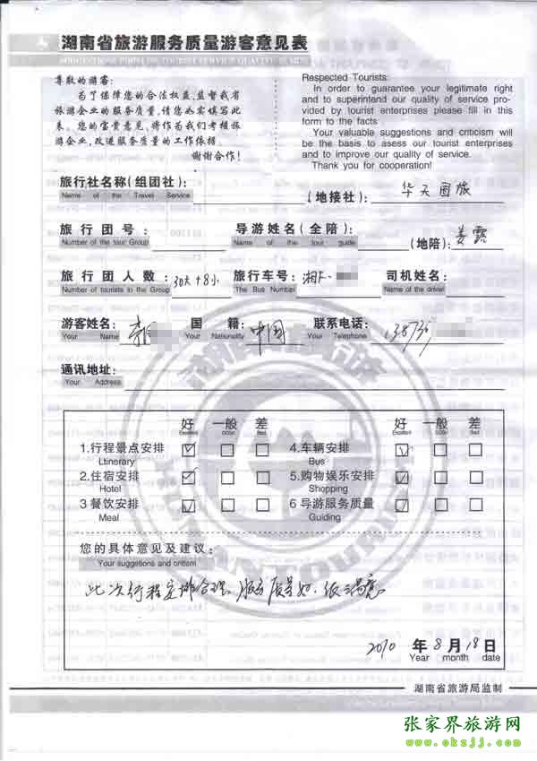2010年8月18日李先生一行30位旅游質量反饋:此次行程安排合理,服務質量好,很滿意