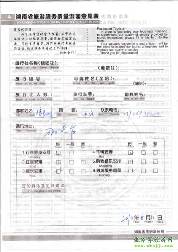 2010年8月12日福建張先生旅游質(zhì)量反饋