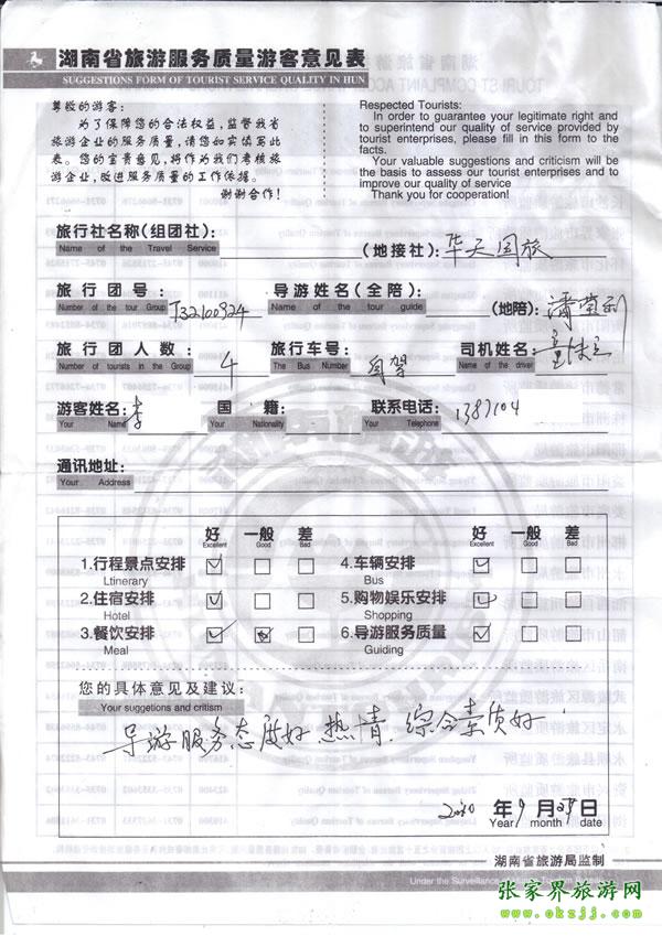 2010年9月24日 李先生一行 高度評價(jià)華天國旅導(dǎo)游小潘