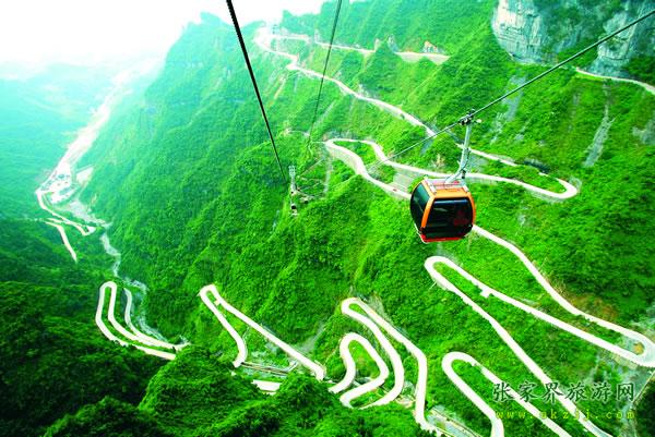 考慮到索道運(yùn)行時間較長,高溫時游客們需要通風(fēng),每個轎廂專門設(shè)計了兩個通風(fēng)窗,以形成空氣的對流,這人性化設(shè)計在國內(nèi)是唯一的。索道鋼繩則來自于法國,直徑50.1mm,每米重達(dá)10kg,確保游客安全無虞。 天門山索道最大的亮點(diǎn)就是它的爬坡面支架的設(shè)計 ,這個支架共有壓索輪96個,托索輪16個,它綜合了現(xiàn)代物理學(xué)、現(xiàn)代工程學(xué)、現(xiàn)代制造業(yè)中最先進(jìn)的理論和成果,應(yīng)用了世界最先進(jìn)的索道技術(shù),從而使這段索道總給人一種蕩氣回腸、氣勢沖天的感覺。 天門山索道以張家界市中心的城市花園為起點(diǎn),直達(dá)天門山頂?shù)脑伎罩谢▓@,猶如一道彩虹飛渡“人間” “天上”,又象一條巨龍騰翔素云蒼穹,依山籍壁,拔地沖天,蕩氣回腸,恢宏壯觀,成為天門山旅游風(fēng)景區(qū)“四大奇觀”之一,為張家界這一世界級風(fēng)景名勝區(qū)又添絕世奇景。