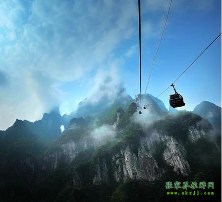 天門(mén)山景區(qū)距離張家界城區(qū)僅8公里,登天門(mén)山不需爬山,天門(mén)山索道直達(dá)山頂。天門(mén)山索道下站位于市內(nèi)官黎坪區(qū),4路、5路、10路等多路公交車(chē)可抵達(dá),通體透明的玻璃建筑加上兩扇藍(lán)色羽翼的造型,整個(gè)索道下站就如一只展翅欲飛的鴿子,是喧嘩鬧市中一道別致的風(fēng)景線(xiàn)。